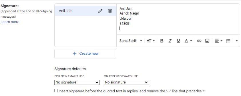 Scroll करके नीचे Signature Options पर जाए क्रिएट न्यू पर क्लिक करें