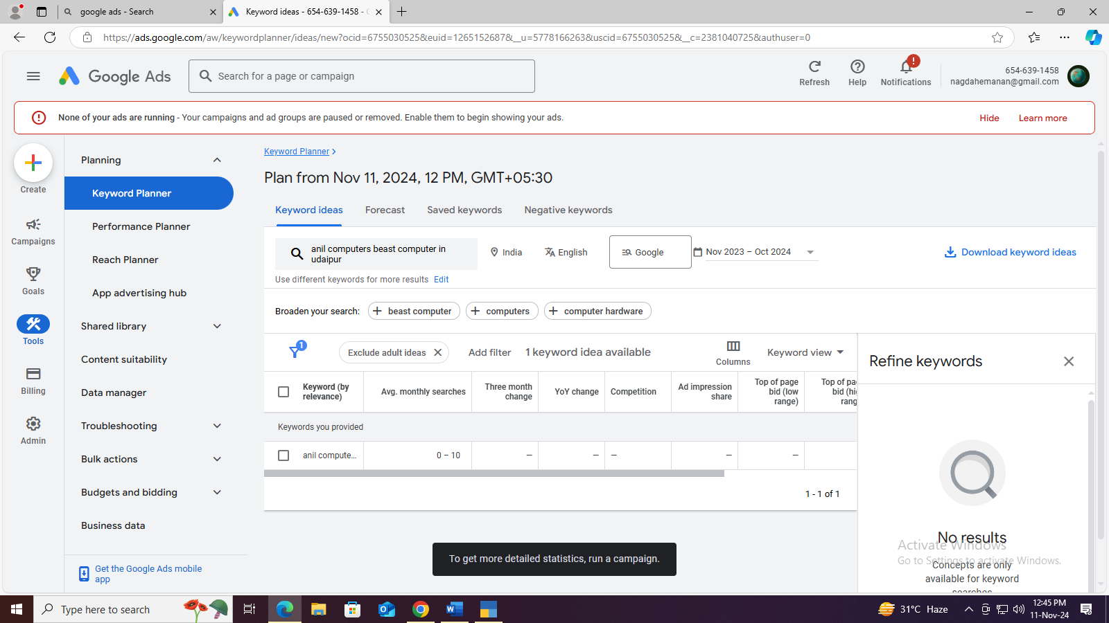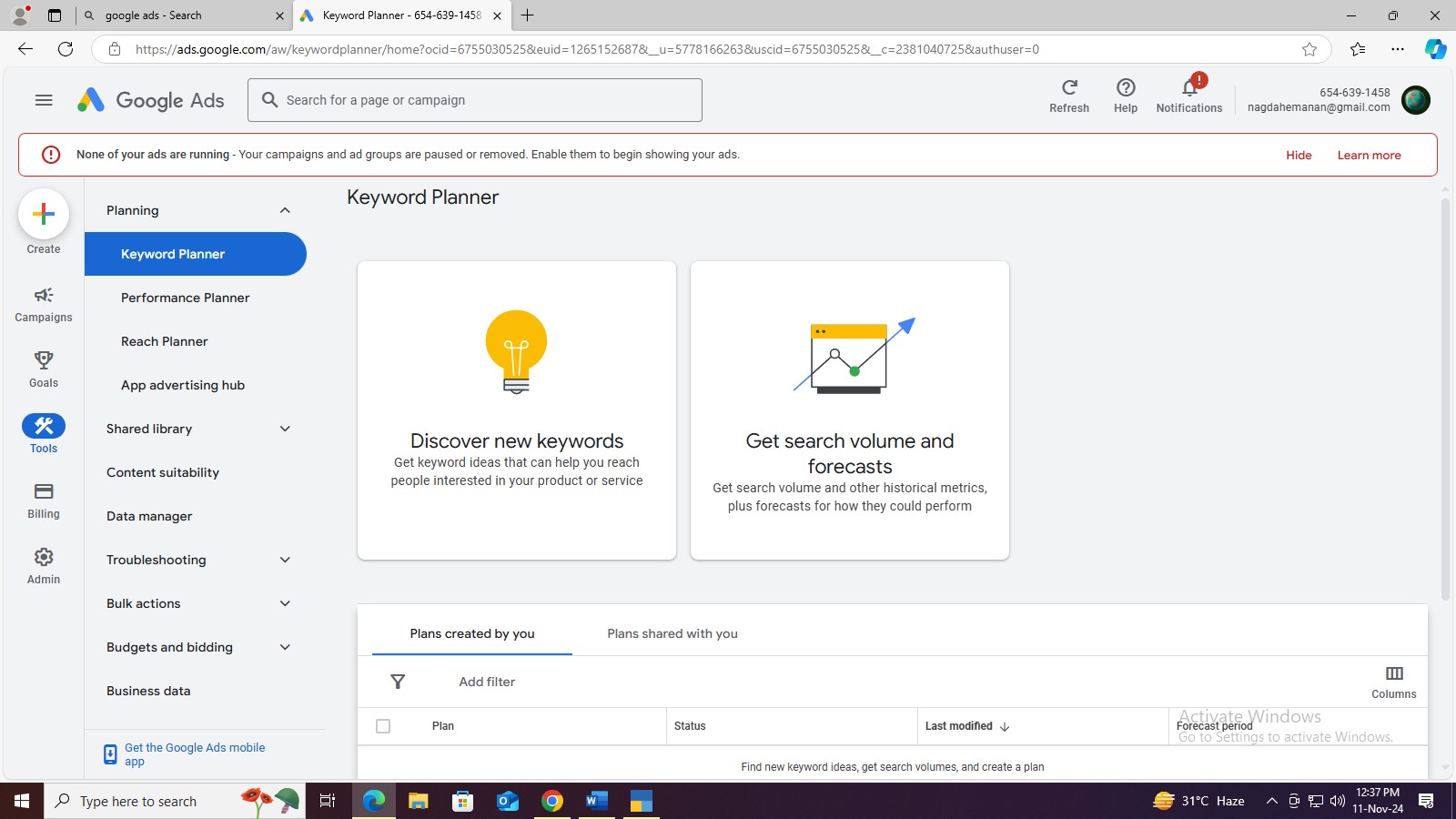 Google ads website गूगल वेबसाइट पर जाना >new account create> login > switch to expert mode> create an account without a campaign > Explorer keyword planner> Tools setting > Planning >> keyword planner
