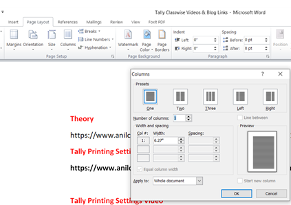 अगर आप तीन से ज्यादा कॉलम इन्सर्ट करना चाहते हैं या कॉलम के बीच में लाइन इन्सर्ट करना चाहते हैं, तो More Column ऑप्शन पर क्लिक करें। क्लिक करते ही Columns का निम्न डायलॉग बॉक्स ओपेन हो जाएगा। जिसमें आप अपने अनुसार सेटिंग्स कर सकते हैं।