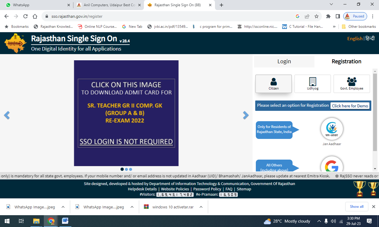 यदि हम सरकारी सेवाओ का लाभ लेना चाहते है तो हमें SSO में Login करना होगा। इसके लिए हमे https://sso.rajasthan.gov.in पर Registration करना होगा।