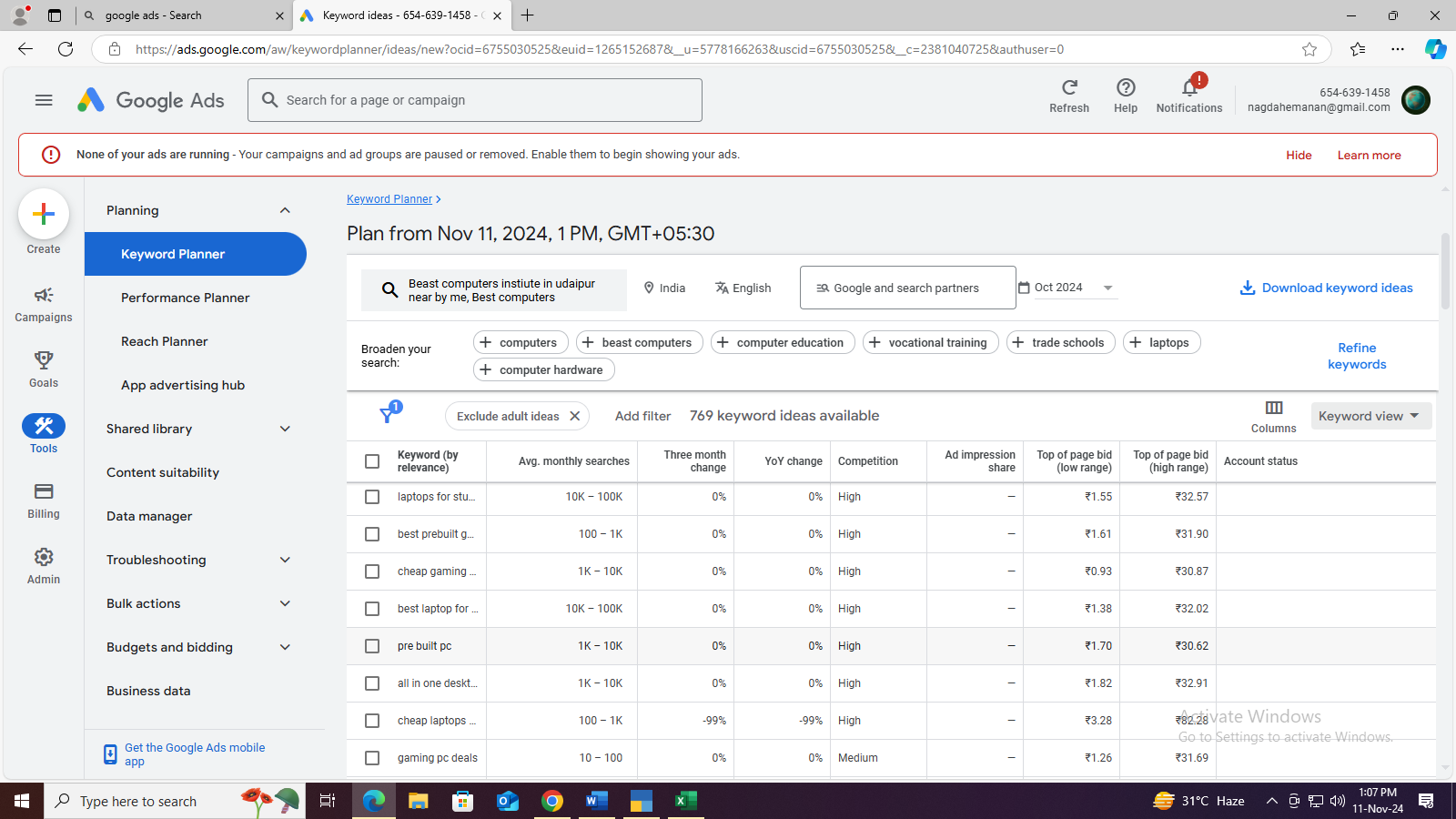 Google keywords Planner