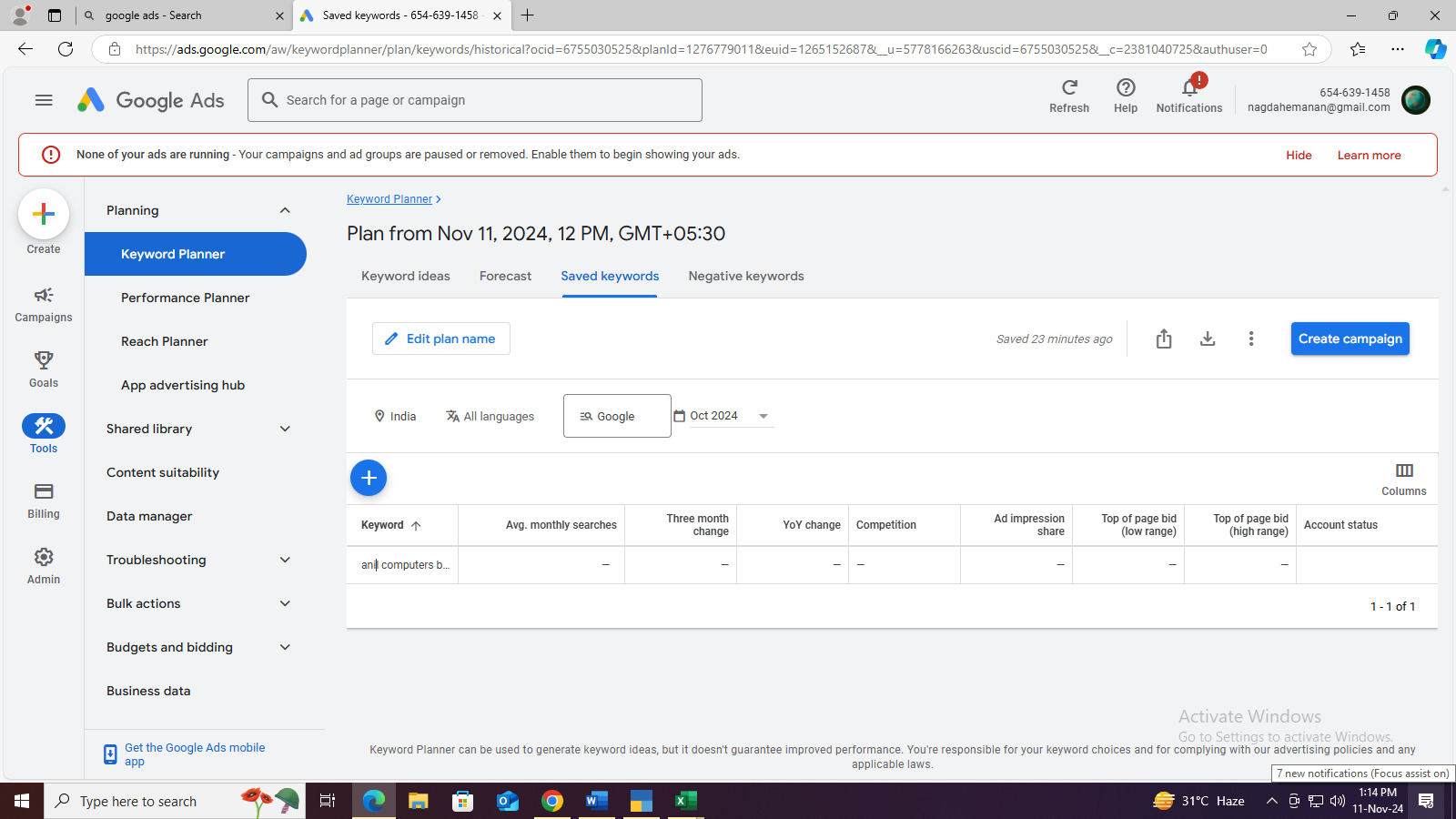 Google ads website गूगल वेबसाइट पर जाना >new account create> login > switch to expert mode> create an account without a campaign > Explorer keyword planner> Tools setting > Planning >> keyword planner