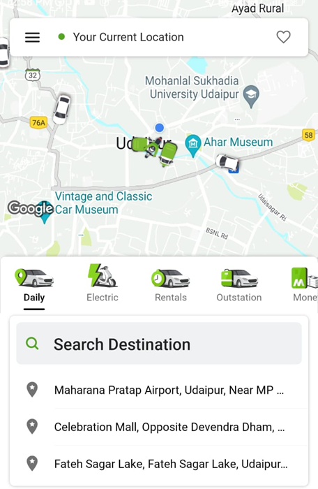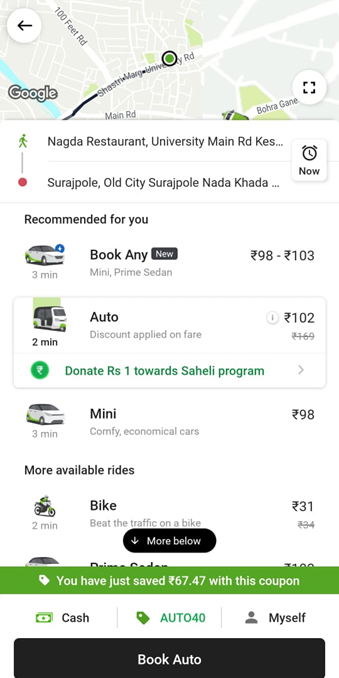 अब एक नया पेज ओपन होगा, जहां आपको अपनी पिक अप और ड्राप लोकेशन दर्ज करनी होगी। यहां पर आपको अलग-अलग ऑप्शन दिए जाएंगे जैसे और Book Any ,Auto, Mini, Bike और उसके सामने आपको रेट भी दिखेगी