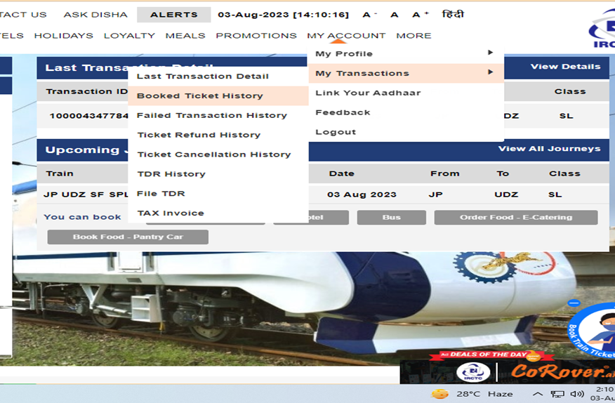 My Account Option में क्लिक करे, उसके बाद My Transactions पर और बाद में Booked Ticket History पर क्लिक कर लीजिए
