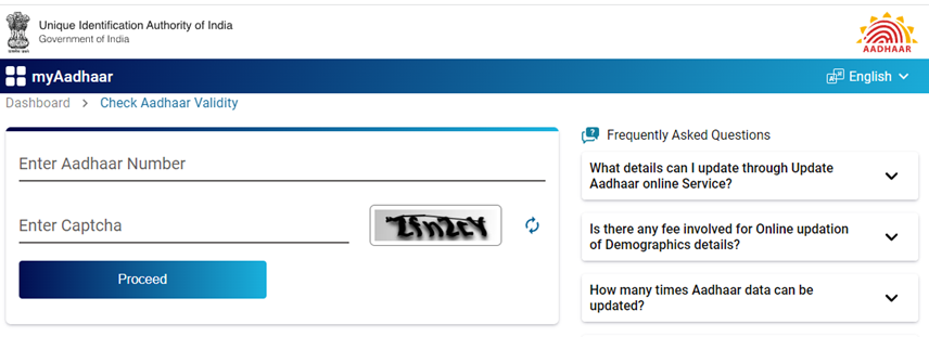 यहां पर आपको अपने आधार कार्ड के नंबर Fill करने हैं और फिर जो Captcha दे रखा है Captcha वहां टाइप करके Proceed पर क्लिक करना है।
