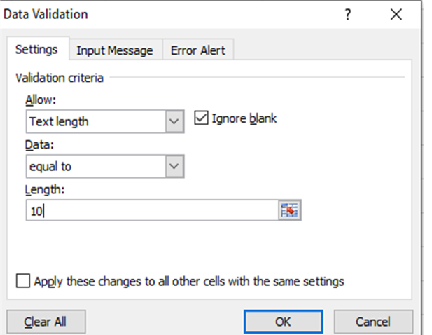Selected range >Click on data tab >Click on data validation >Allow - text length >equal to > Length - 10 >ok