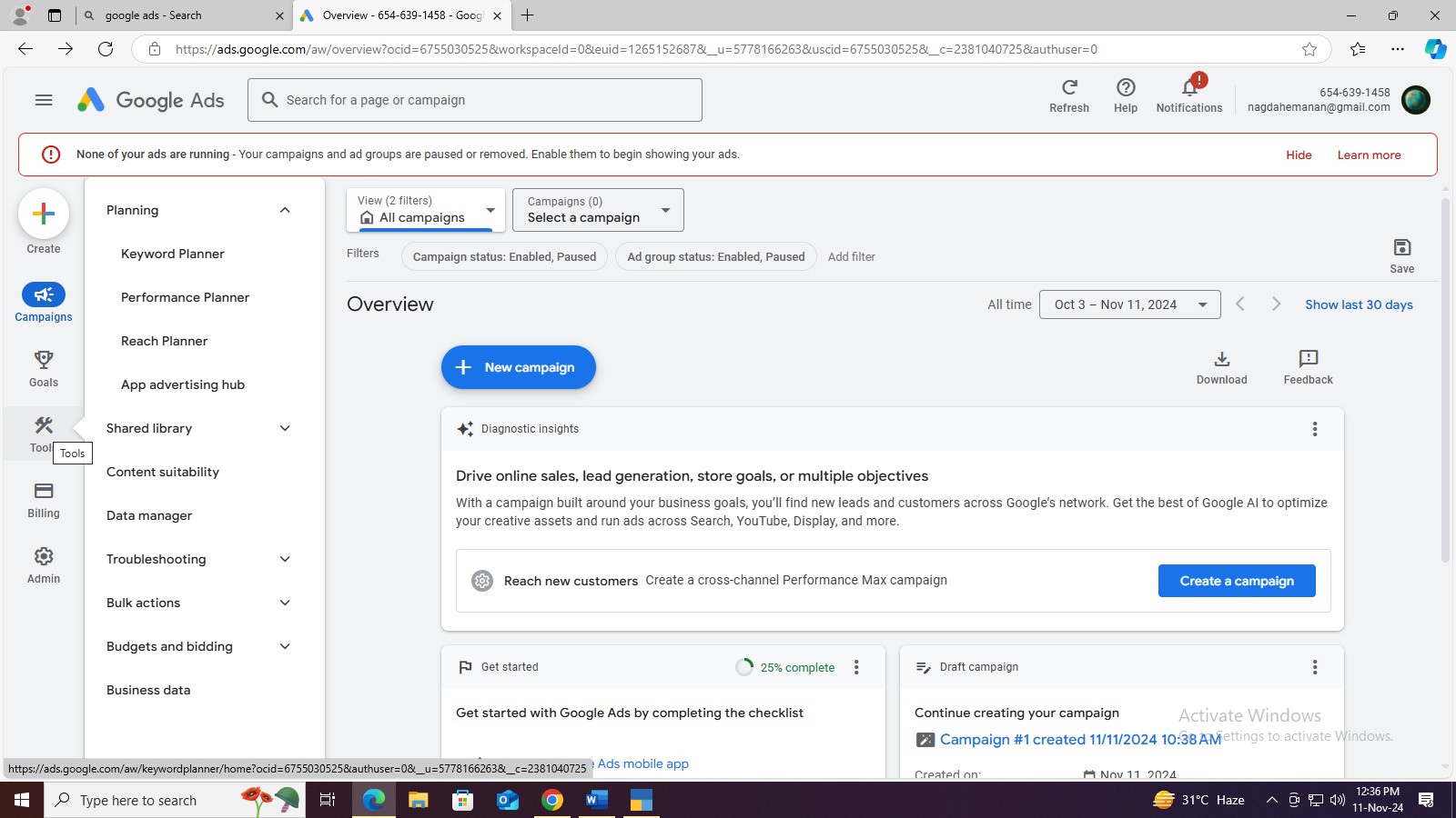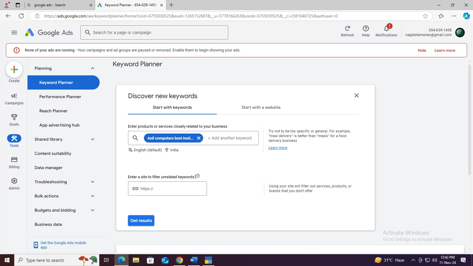 Google ads website गूगल वेबसाइट पर जाना >new account create> login > switch to expert mode> create an account without a campaign > Explorer keyword planner> Tools setting > Planning >> keyword planner