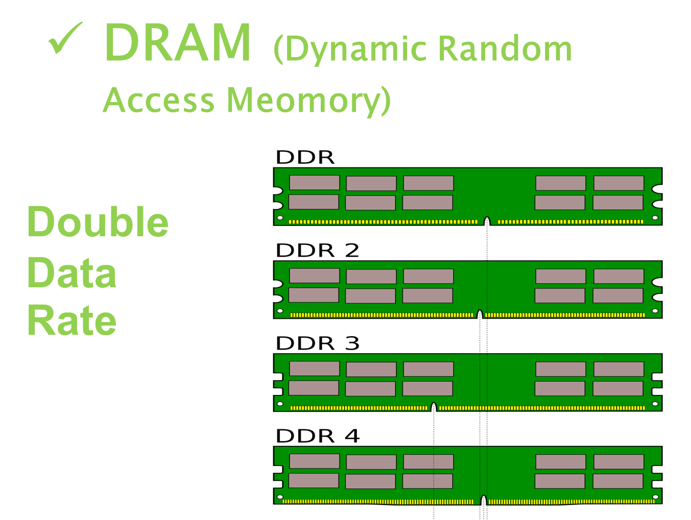 1- डायनैमिक रैम(Dynamic RAM):- इसे हमDRAM भी कहते है। इसमें एक ट्रांजिस्टर और एक कैपेसिटर लगा होता है। DRAM को बार-बार रिफ्रेश (Refresh) किया जाता है। जिसके कारण इसकी गति धीमी होती है। बिजली चले जाने पर इसकी सूचना नष्ट हो जाती है।