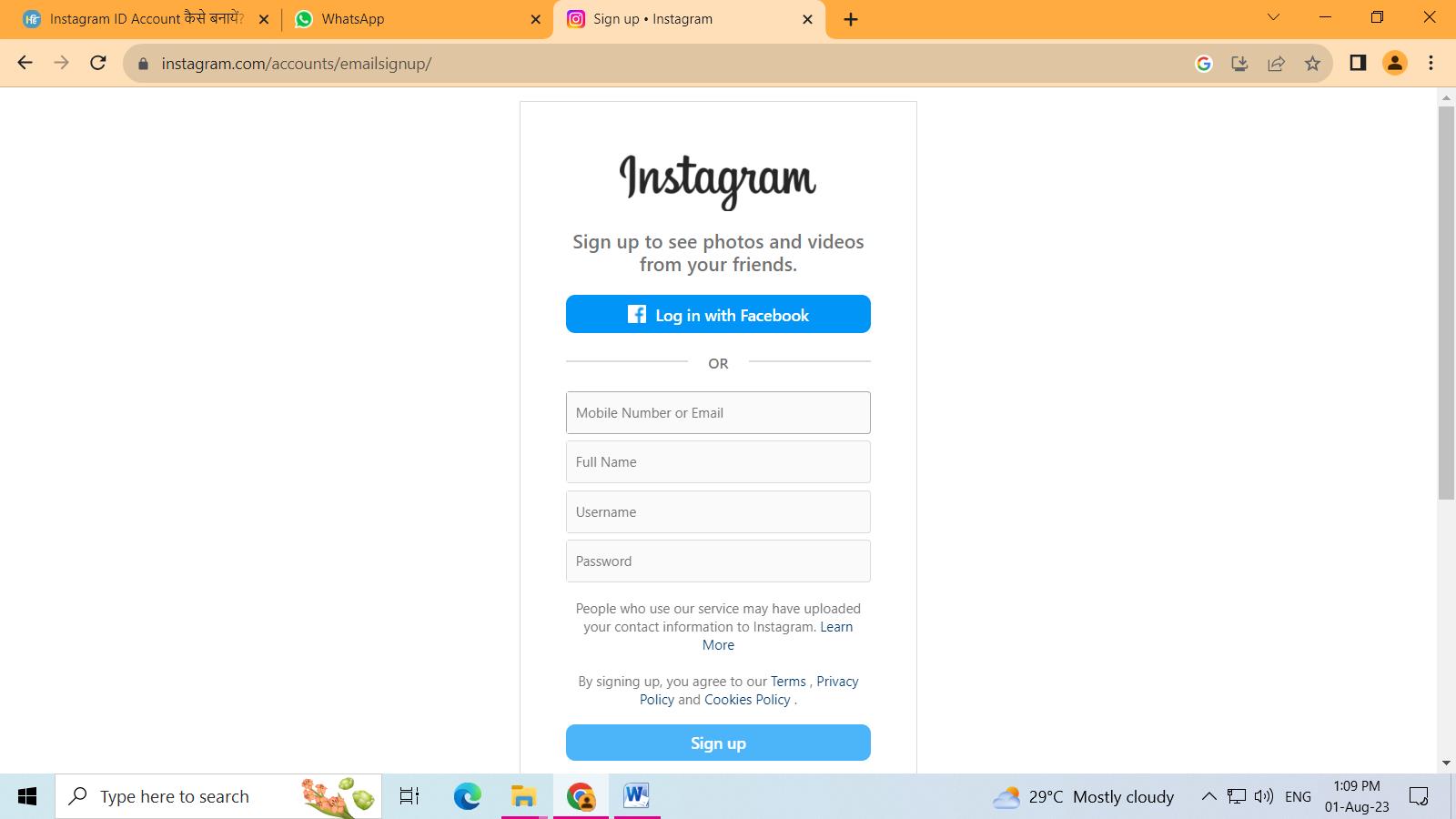 Facebook से Connect करने का OR Phone Number या Email id से अकाउंट बनाने का options आपको मिलेगा।इसके अंदर की सारी Details आपको Fill करनी है और साइन अप पर क्लिक करना है।